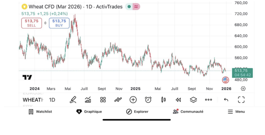D’après la plateforme TradingView, cours du Wheat CFD, marchés des FUTURES