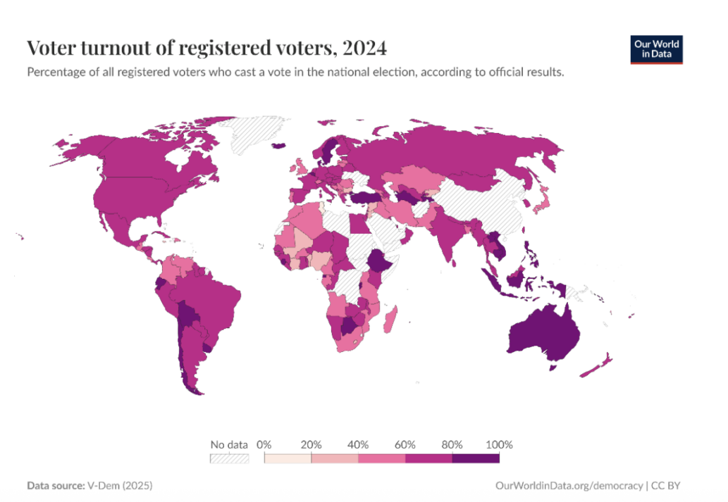 La carte mondiale ci-contre représente le taux de participation électorale par rapport au nombre d’individus inscrits lors d’élections nationales dans de nombreux pays démocratiques. Cette carte revêt une certaine importance, démontrant le fonctionnement réel du vote dans les systèmes démocratiques.