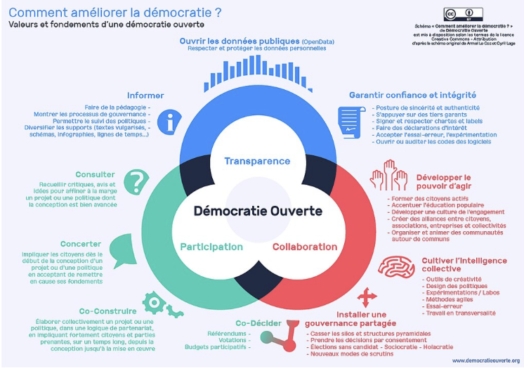 Le schéma « Comment améliorer la démocratie ? » propose une vision moderne et participative de la démocratie, appelée « démocratie ouverte ». Ce modèle repose sur trois piliers essentiels : la transparence, la participation et la collaboration. Ces valeurs sont présentées comme les fondements d’un système politique plus inclusif, où les citoyens ne sont plus de simples spectateurs, mais des acteurs actifs de la vie publique.
